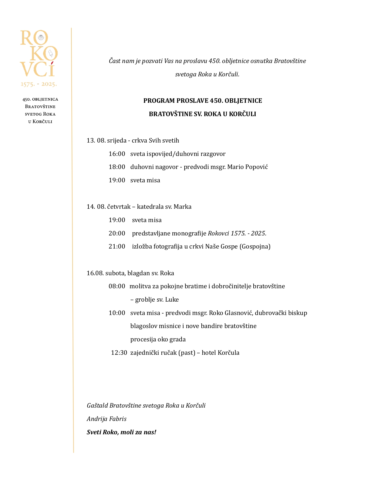 U sklopu proslave blagdana sv. Roka, u Korčuli se obilježava 450 godina neprekidnog djelovanja Bratovštine sv. Roka – jedne od najstarijih bratovština na otoku, koja stoljećima njeguje duhovnu i kulturnu baštinu Korčule.
