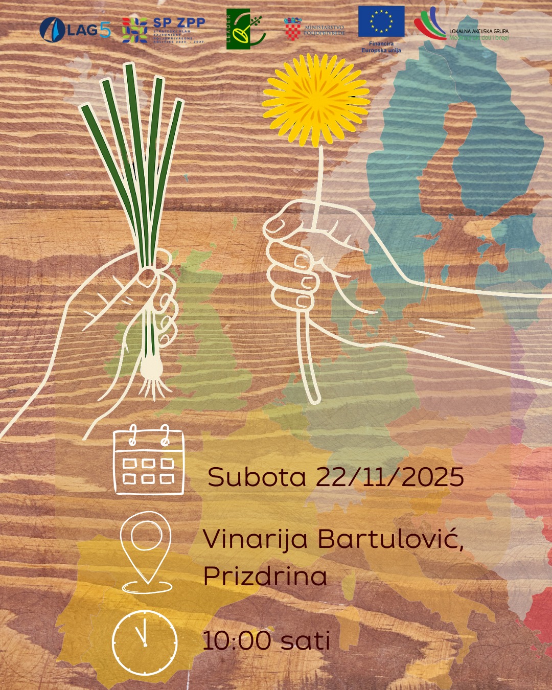U sklopu projekta “Food Without Borders: Meeting each other through flavours”, Lokalna akcijska grupa LAG 5 organizira radionicu prepoznavanja i pripreme samoniklog jestivog bilja. Radionica će se održati u subotu, 22. studenog 2025. godine, u Vinariji Bartulović u Prizdrini s početkom u 10:00 sati.
