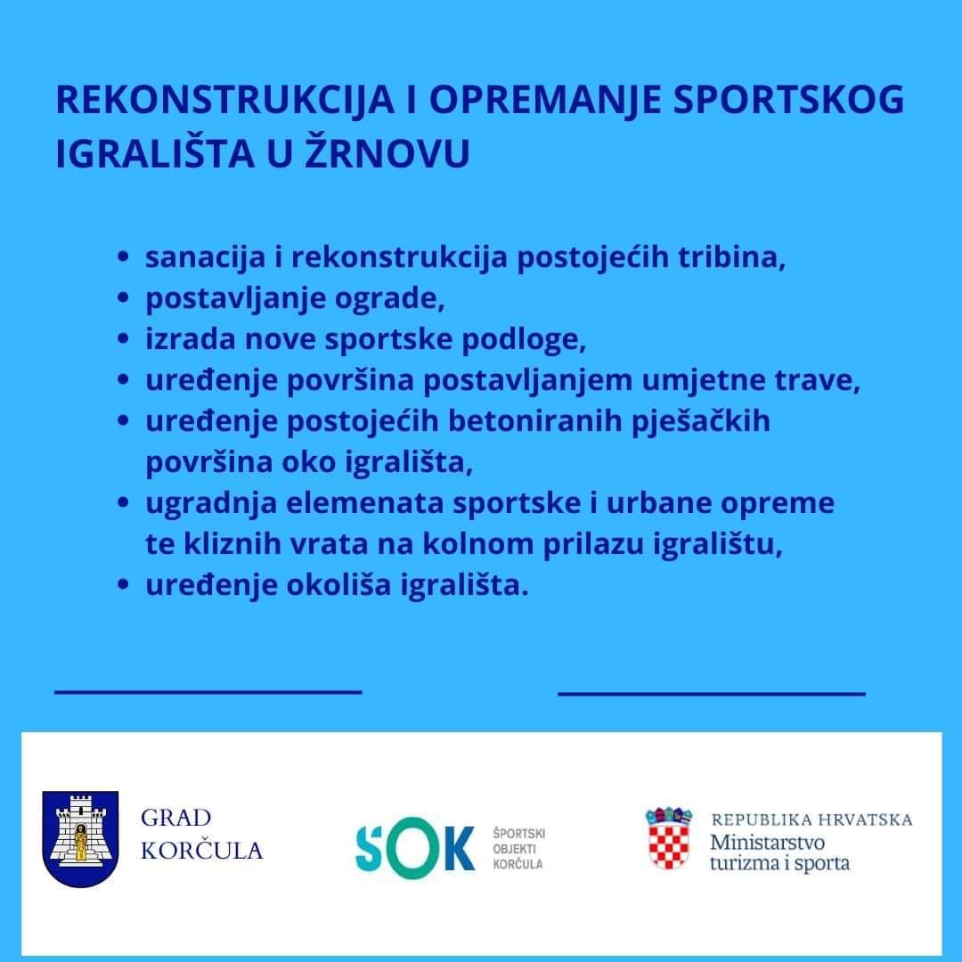 Planirana je sanacija i rekonstrukcija postojećih tribina, izrada nove sportske podloge, uređenje procijednih površina postavljanjem slojeva sa završnom umjetnom travom, uređenje postojećih betoniranih pješačkih površina oko igrališta, dobava i ugradnja elemenata sportske opreme, urbane opreme te kliznih vrata na kolnom prilazu igralištu.