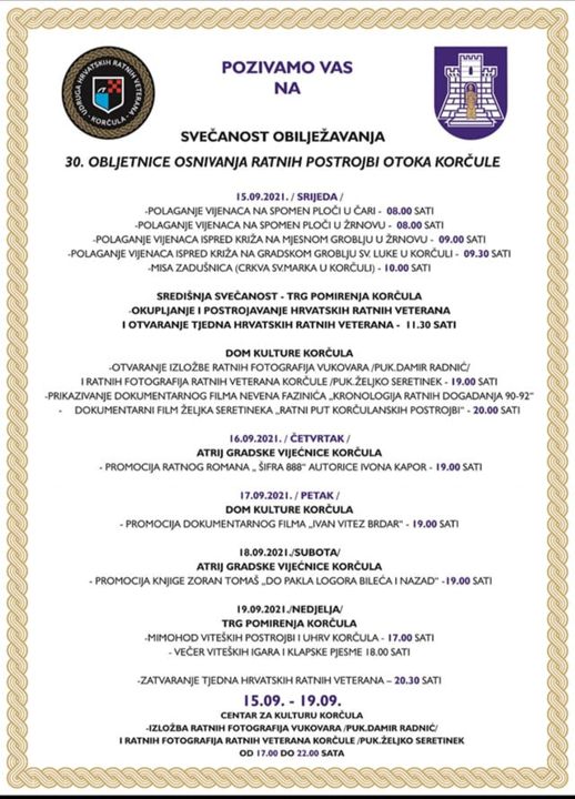 Središnja svečanost obilježavanja 30. obljetnice osnivanja ratnih postrojbi otoka Korčule i otvaranje tjedna hrvatskih ratnih veterana održat će se 15. rujna 2021. s početkom u 11:30 sati na Trgu pomirenja.