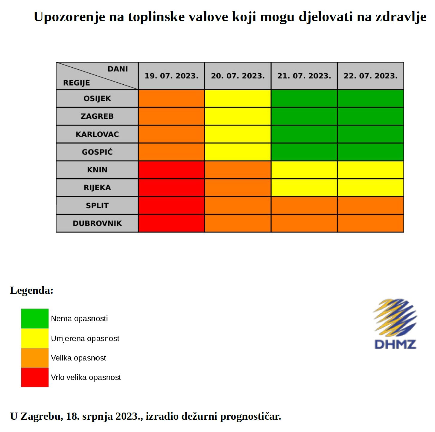 Za Dubrovačko-neretvansku županiju za srijedu 19. srpnja prognozirana je vrlo velika opasnost od pojave toplinskog vala dok je za razdoblje od četvrtka 20. do subote 22. srpnja 2023. prognozirana velika opasnost od pojave toplinskog vala.