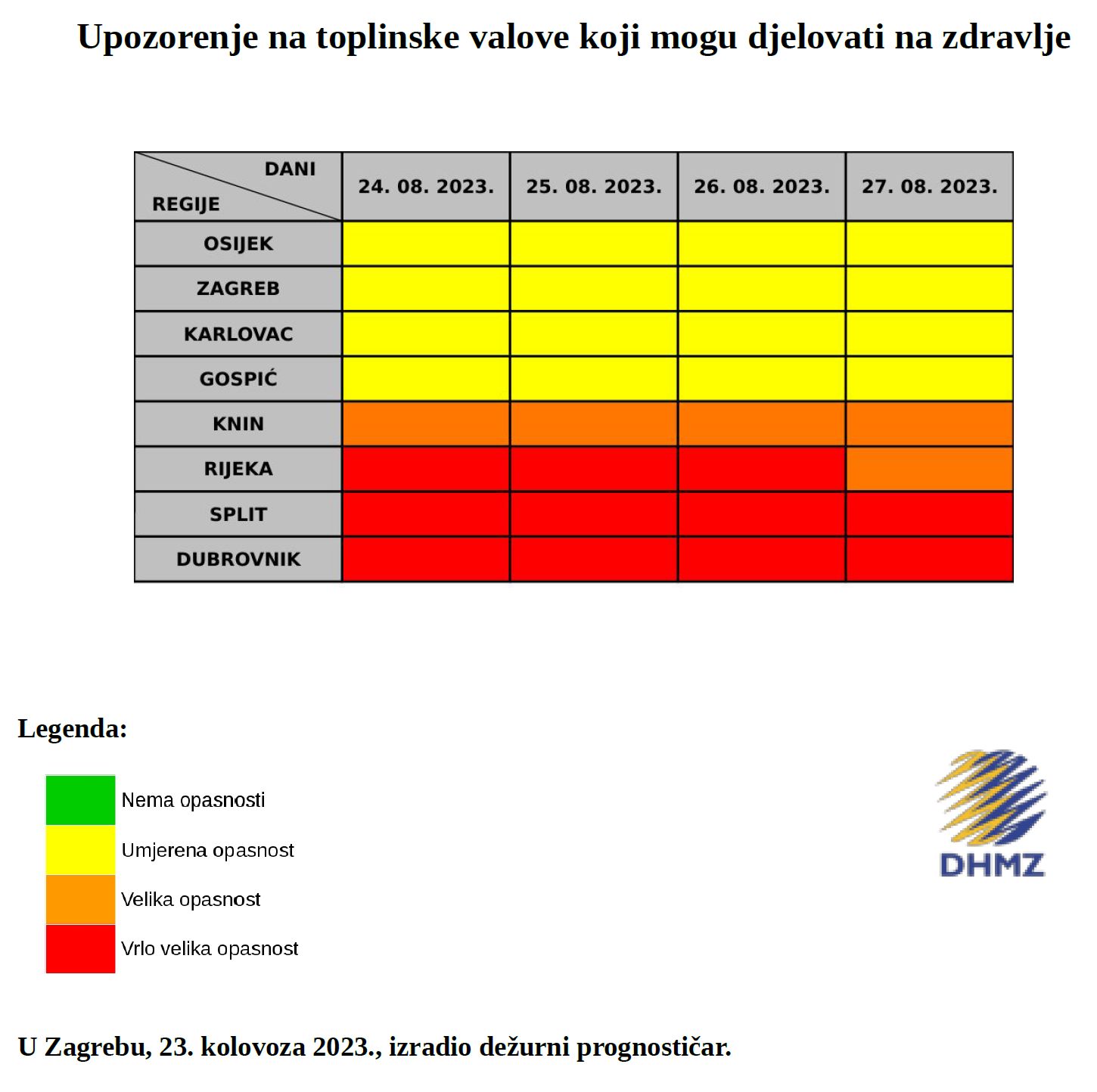 Za Dubrovačko-neretvansku županiju za razdoblje od četvrtka 24. do nedjelje 27. kolovoza 2023. prognozirana je vrlo velika opasnost od pojave toplinskog vala.