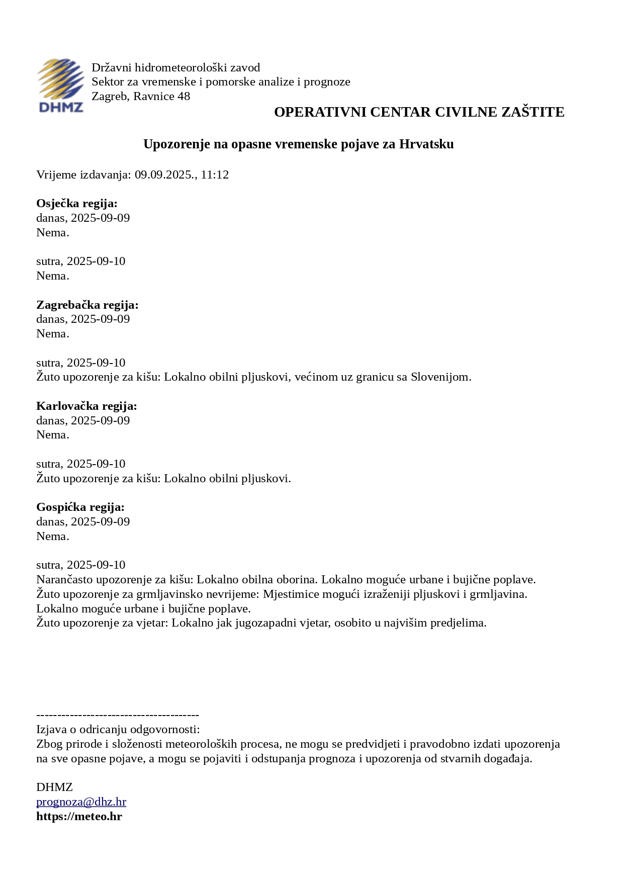 Državni hidrometeorološki zavod objavio je upozorenje na opasne vremenske pojave za 9. i 10. rujna 2025.