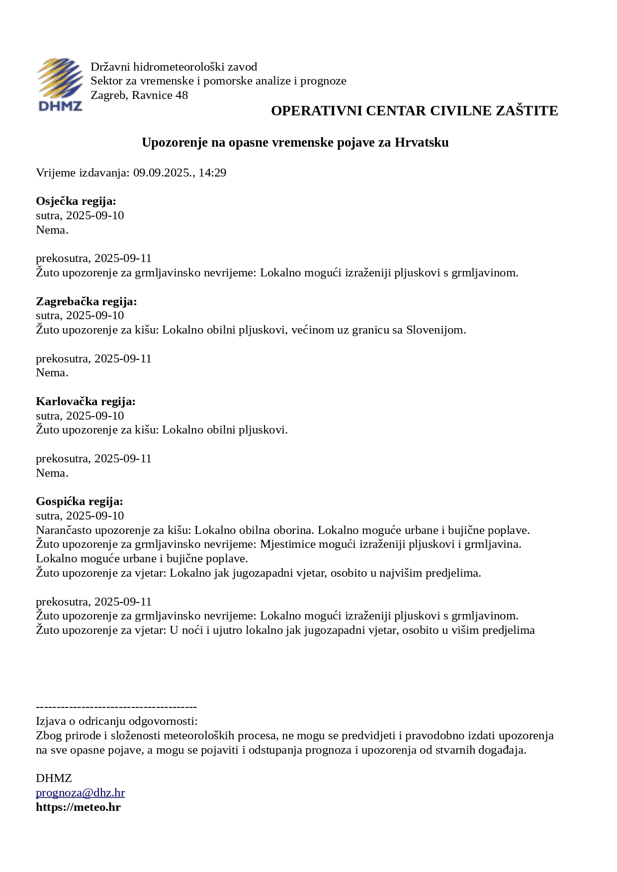 Državni hidrometeorološki zavod objavio je upozorenje na opasne vremenske pojave za 10. i 11. rujna 2025.