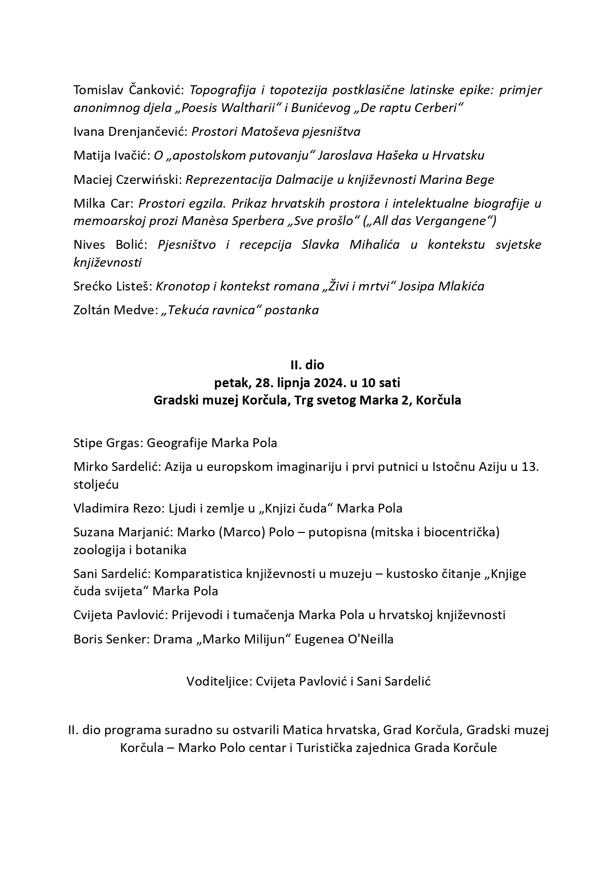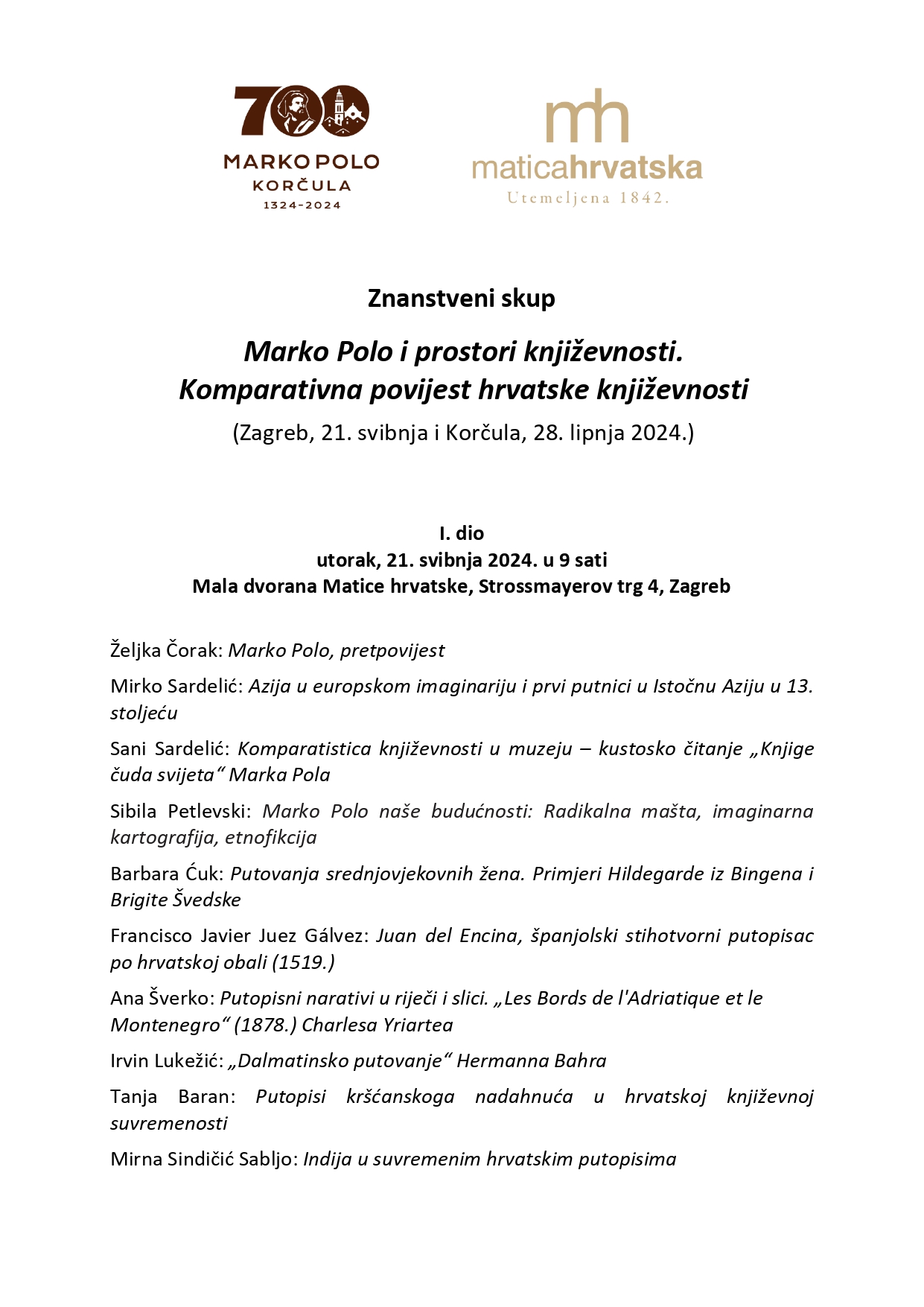 Znanstveni skup Marko Polo i prostori književnosti – Komparativna povijest hrvatske književnosti održat će se 21. svibnja 2024. u Zagrebu, u Maloj dvorani Matice hrvatske, Strossmayerov trg 4, s početkom u 9 sati. Riječ je o prvom dijelu komparatističkog skupa s međunarodnim sudjelovanjem koji je posvećen istraživanju ovog inspirativnog srednjovjekovnog autora i njegovog putopisnog teksta, utjecaju na kasnija razdoblja, kao i ostale oblike umjetnosti, te fenomenu trajne recepcije i interesa.